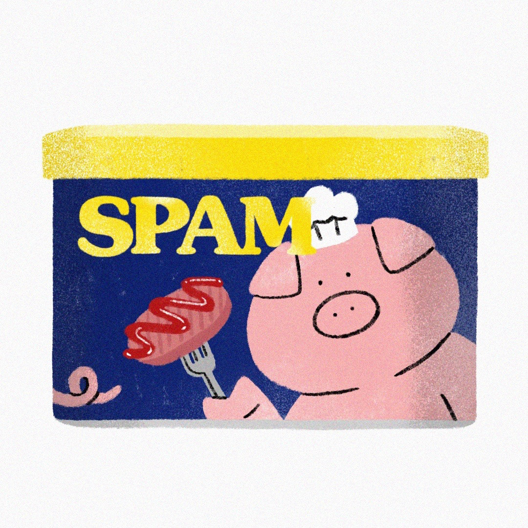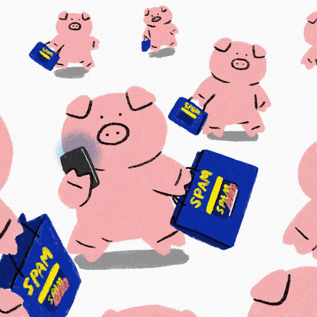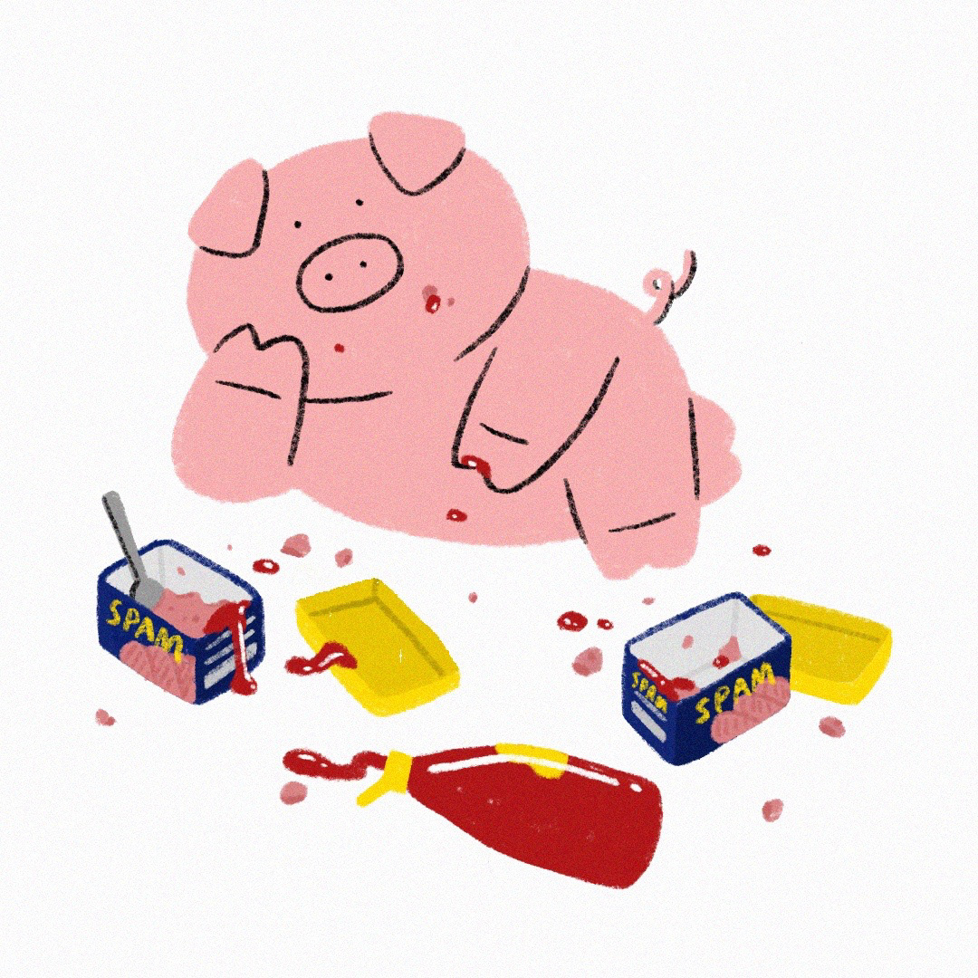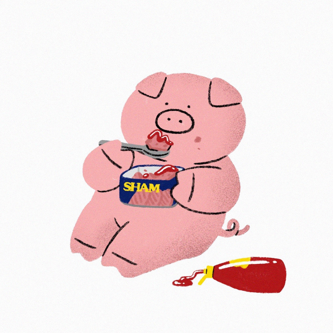 어느 명절, 선물받은 스팸을 들고 이동하는 사람들을 보다 떠올라 그리게 된 한 장의 일러스트가 '부-부-'의 시작이 되었습니다. 스팸을 좋아하는 돼지캐릭터라니! 여기저기 흘려린 케찹은 어딘가 그로테스크하기도 합니다.